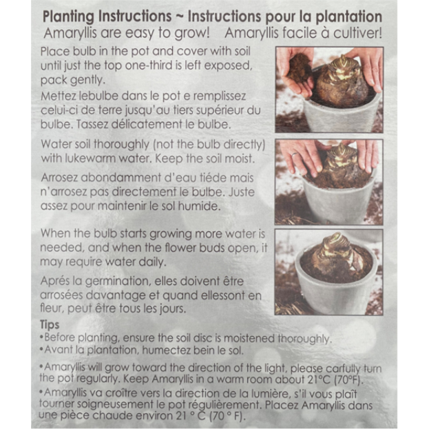Maintenance Requirements: Moderate; plant in well-draining soil with the top third of the bulb exposed; water sparingly until growth appears, then keep evenly moist. Provide bright light and rotate for even growth. After blooming, with proper care, bulbs can be stored and regrown for the following season.