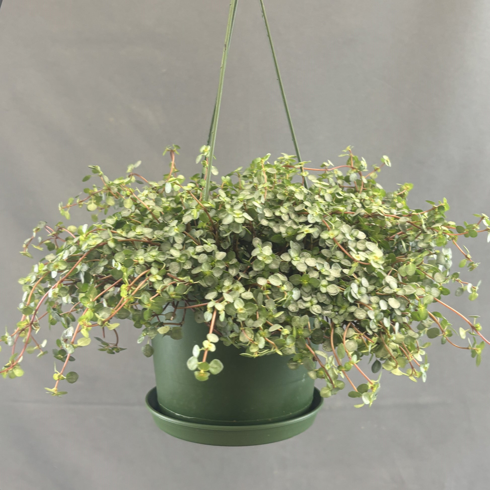 Features dainty metallic gray-green leaves and red stems.