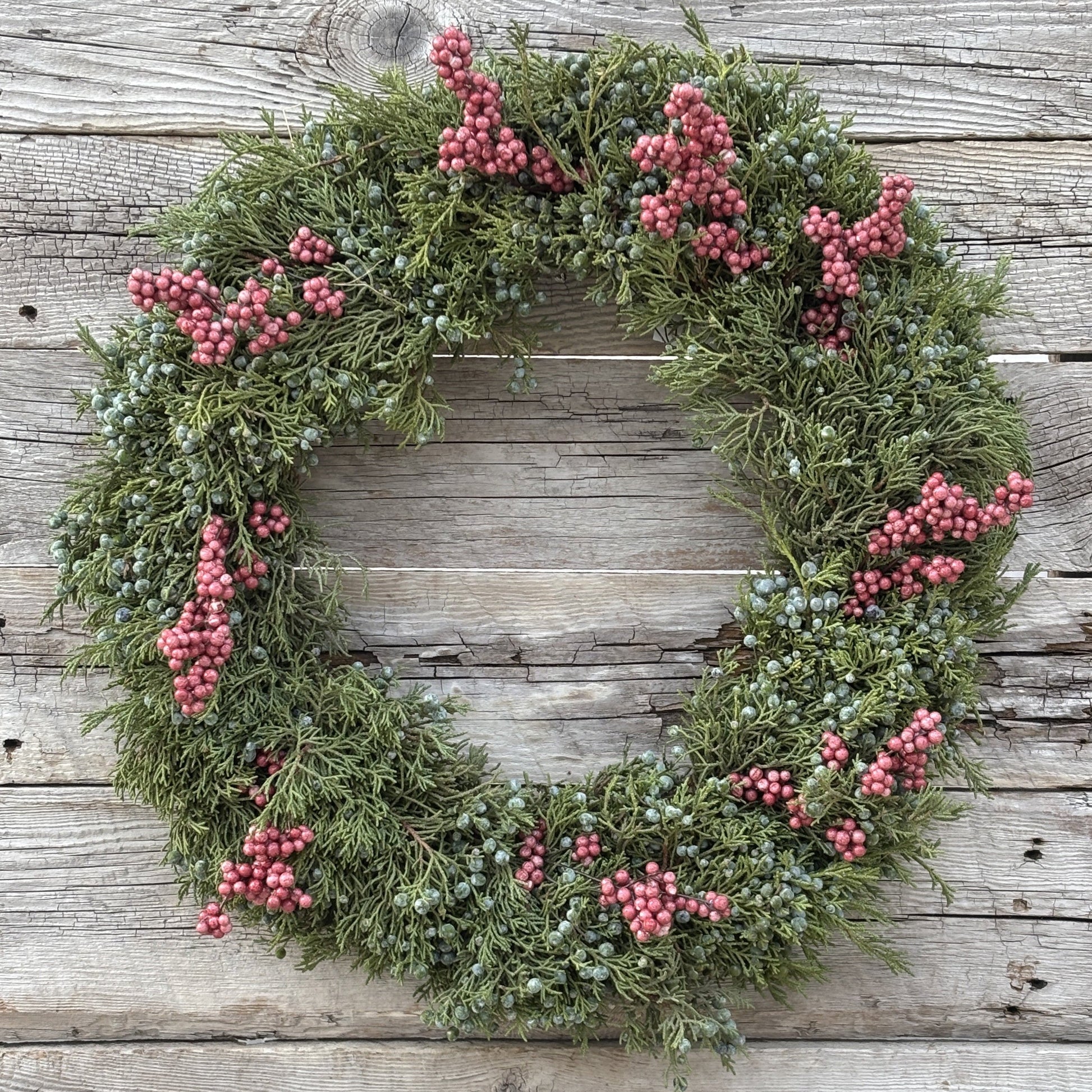 A holiday wreath made of fresh juniper branches, which gives a natural evergreen scent and soft blue-green colour. Artificial pepperberries are added for a pop of colour that lasts all season without shrivelling or staining.